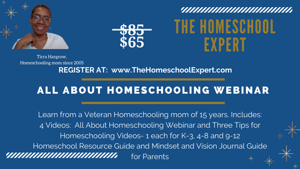 Includes The All About Homeschooling Webinar, three videos with tips covering each of the main three grade categories: K-3, 4-8 and High School; A Resource Guide listing what Tirra used to homeschool her sons; and a Mindset and Journal Guide for Parent to help parents plan for the best start in homeschooling.